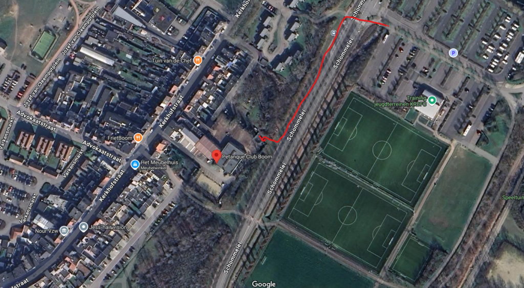 Tijdens kampioenschappen of grote tornooien zal de parking aan onze locatie zelf niet beschikbaar zijn. Best kan er dan geparkeerd worden op de parking van de Schorre. Van daar kan je tevoet over steken een aantal meters verder via een voetgangers ingang zo onze locatie betreden (zie afbeelding voor de korte route)